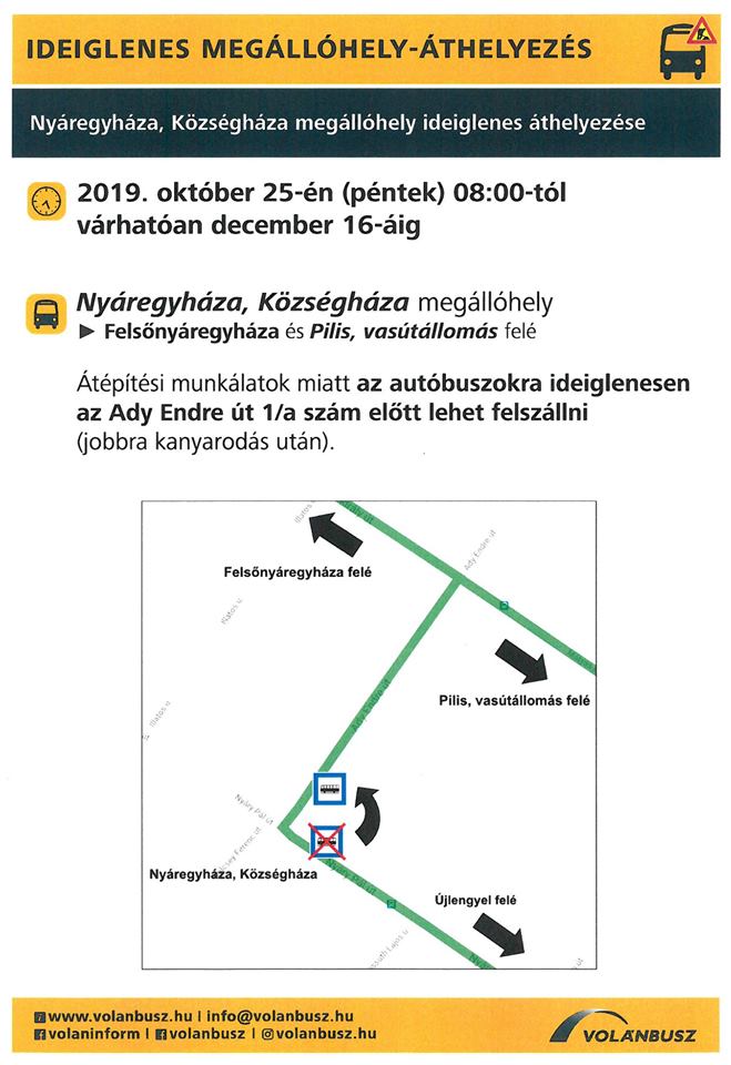 Tájékoztatjuk a Tisztelt Lakosságot, hogy a Nyáregyháza, Községháza megállóhely ideiglenes áthelyezésére kerül sor 2019. október 25-én (péntek) 08:00-tól várhatóan december 16-áig.